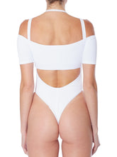 Features strappy detailing that wraps around the torso for a bold, architectural effect