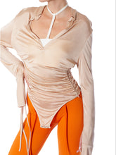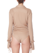 Designed with extra-long sleeves and delicate strappy details for a dramatic, elongated silhouette