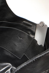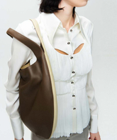 The Aouda Sack Bag is crafted from 100% Calfskin, with a solid shoulder strap, solid or two tone color, stamp logo resulting in clean timeless silhouette.