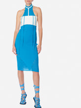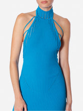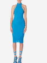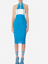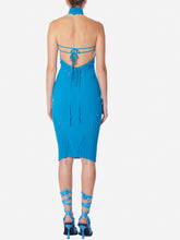 Ribbed knit bodycon halter midi dress with adjustable straps and contrasting open knit details. Available in sky blue.