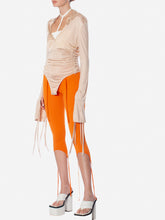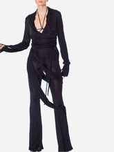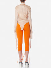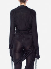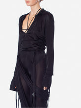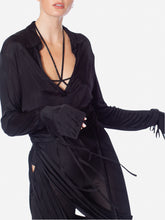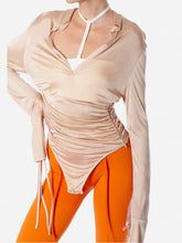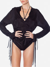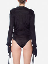 Silky draped jersey bodysuit with button fastening. Plunge v-neckline and extra flong sleeves with strappy details. Available in nude or black.