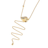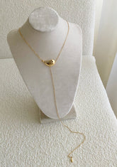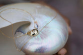 Sensual soft 18k chain pulled through gold nautilus shell set with baguette cut diamonds in a lariat style with organic gold drop. Gold ball on necklace stops the necklace from being pulling too tight on neck. Can be worn on the chest or on the back.