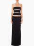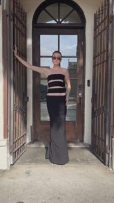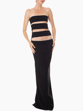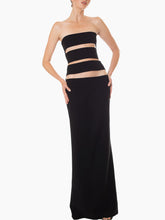 Strapless floor length crepe gown with horizontal cutouts down to the hips.