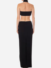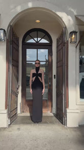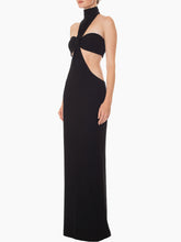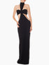 Floor length crepe fabric bandeau gown with high neck fastening and dramatic cut outs at the waist and back.